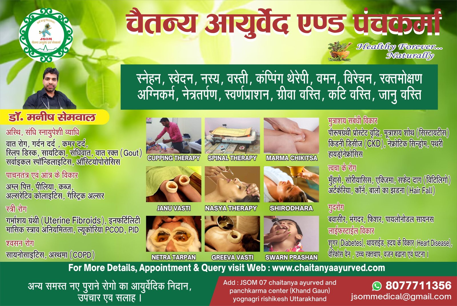 Chaitanya Ayurved and Panchkarma Center, Jsom hospital and diagnostic center, near Railway station, Geeta Nagar, Rishikesh, Uttarakhand 249201